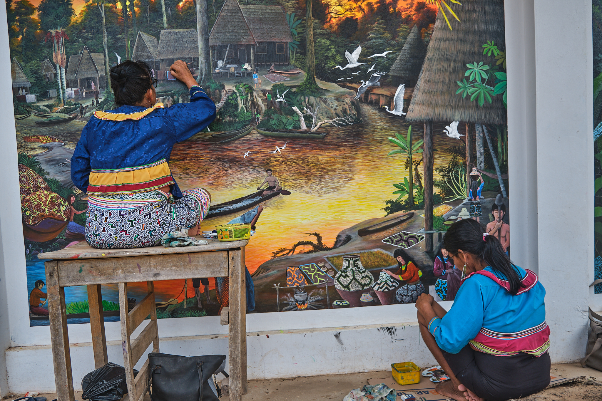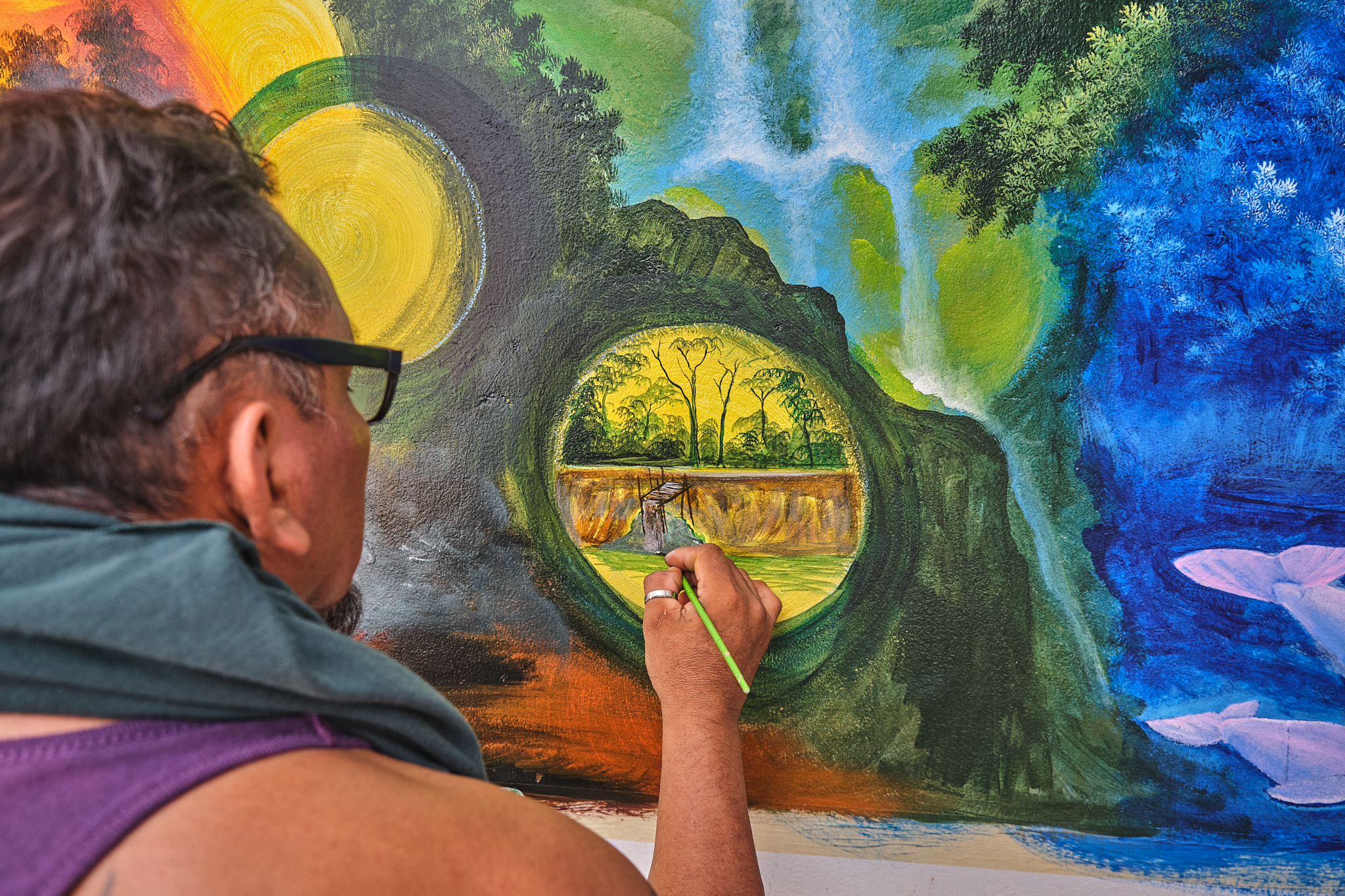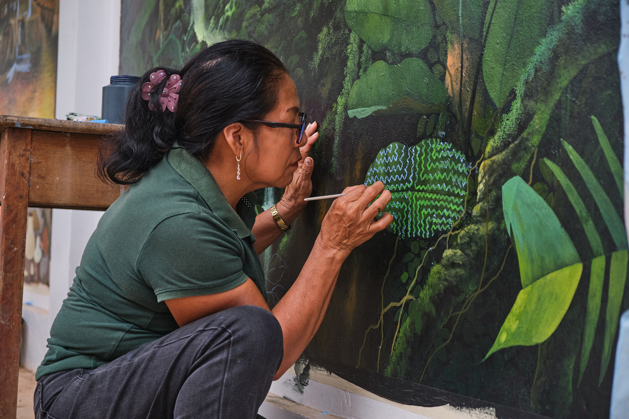 Teresa llegó al día siguiente llena de energía. Además de ser la primera artista indígena presente ese día, era la primera vez que pintaba en una pared. Decidió adornar la superficie de unas hojas que ya había pintado uno de los profesores utilizando sus motivos ancestrales, y también ayudó a elegir la ubicación del pico «Roebiri».