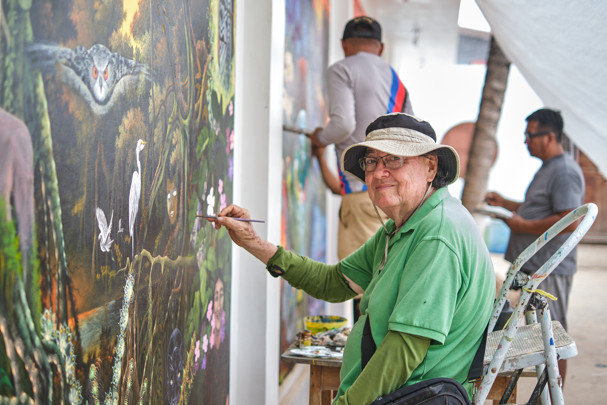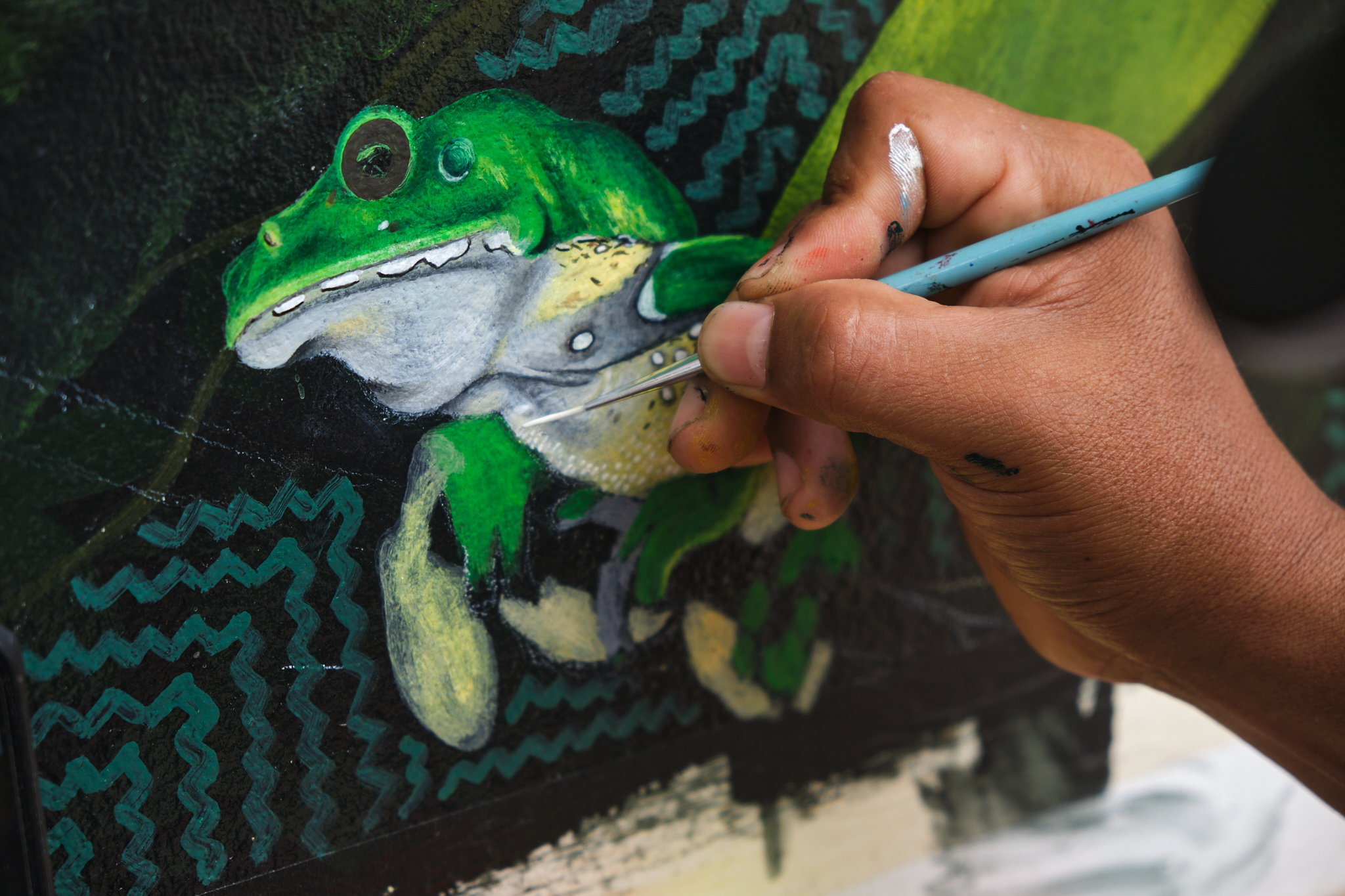 También tuvimos el honor de recibir al legendario artista local Lucho Martínez, quien compartió su magia pintando a una mujer matsés camuflada en medio de un paisaje forestal rodeada de mariposas.