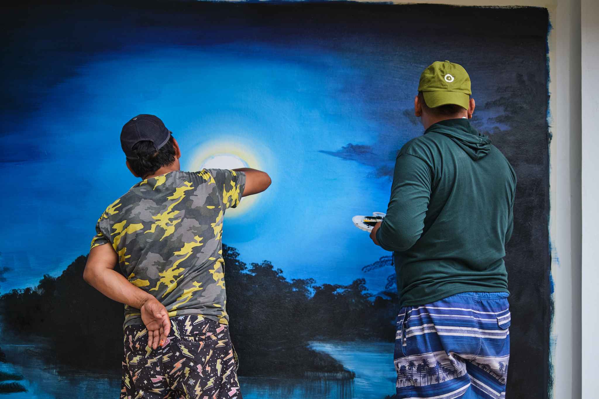 Los días pasaron y cada artista encontró su ritmo y se centró en pequeñas secciones de la pared para añadir los detalles iniciales: la formación de un árbol, las formas de los cuerpos y las siluetas de la naturaleza. Tras la primera semana, poco a poco, el tema de cada mural se fue revelando. Aquí es donde comenzó el meticuloso proceso de detallado, utilizando pinceles, trazos y técnicas especiales que eran característicos de la Escuela de Pintura Amazónica USKO-AYAR.