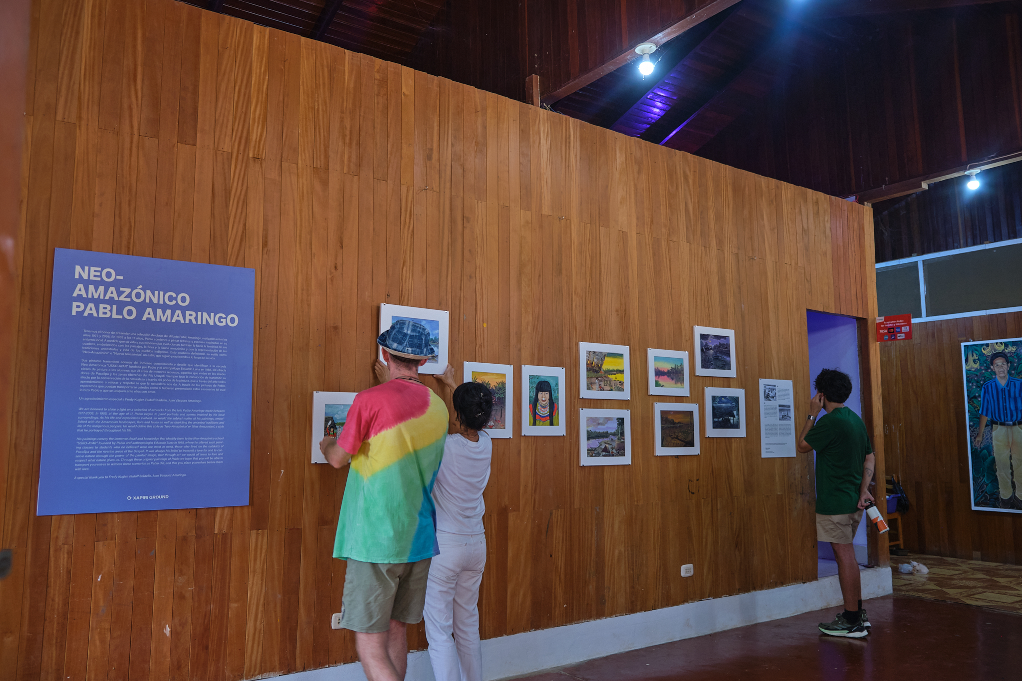 Además, habíamos acordado exhibir una selección de obras originales de la exposición «Neo-Amazónico», que estrenamos en nuestra galería de Cusco, en una de las salas de la escuela. Esta exposición acompañó al evento inaugural en el que se presentó el mural terminado el 15 de noviembre de 2025, en lo que pareció el momento perfecto para compartir estas primeras pinturas en la ciudad de Pucallpa. ¡El plan estaba sellado!