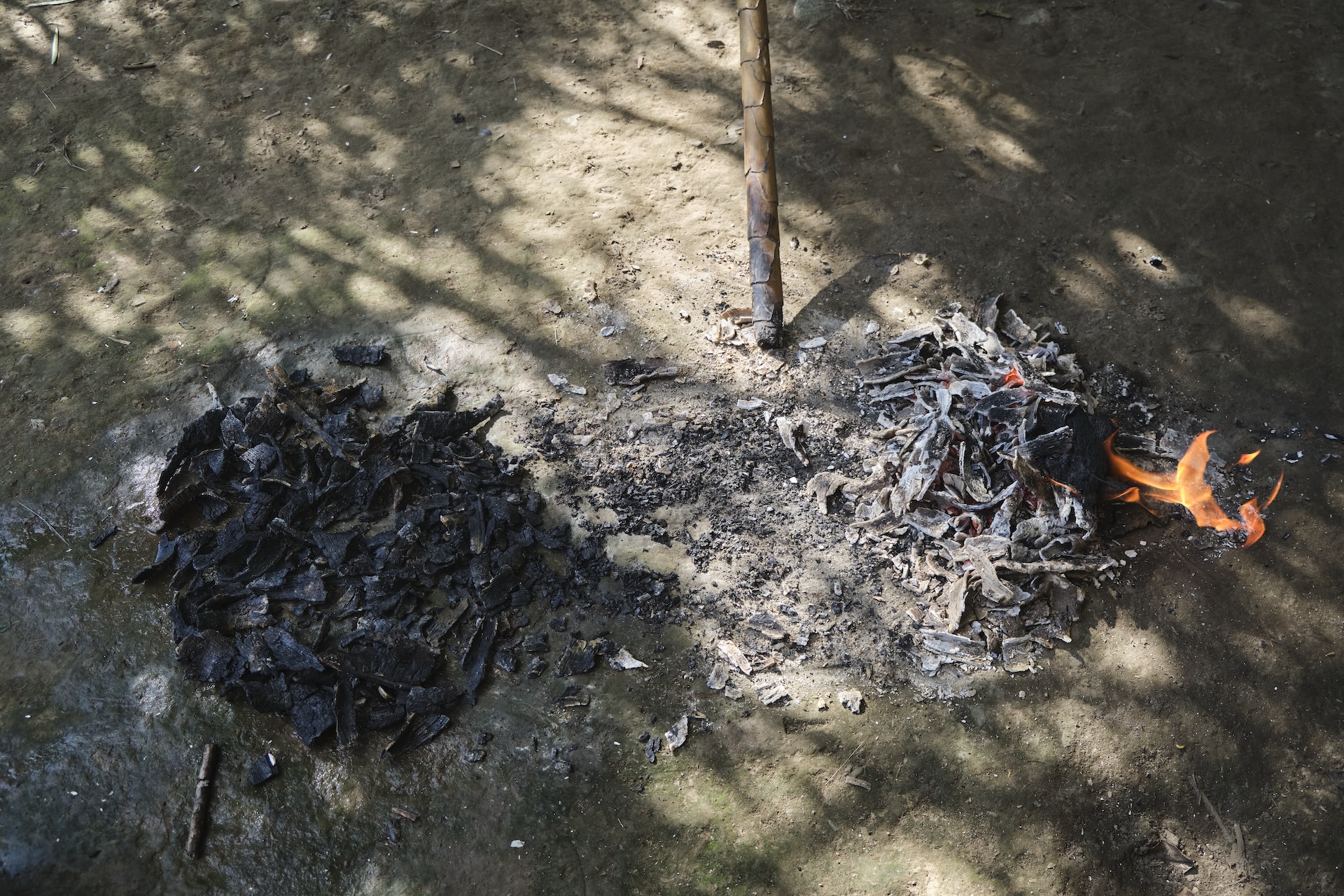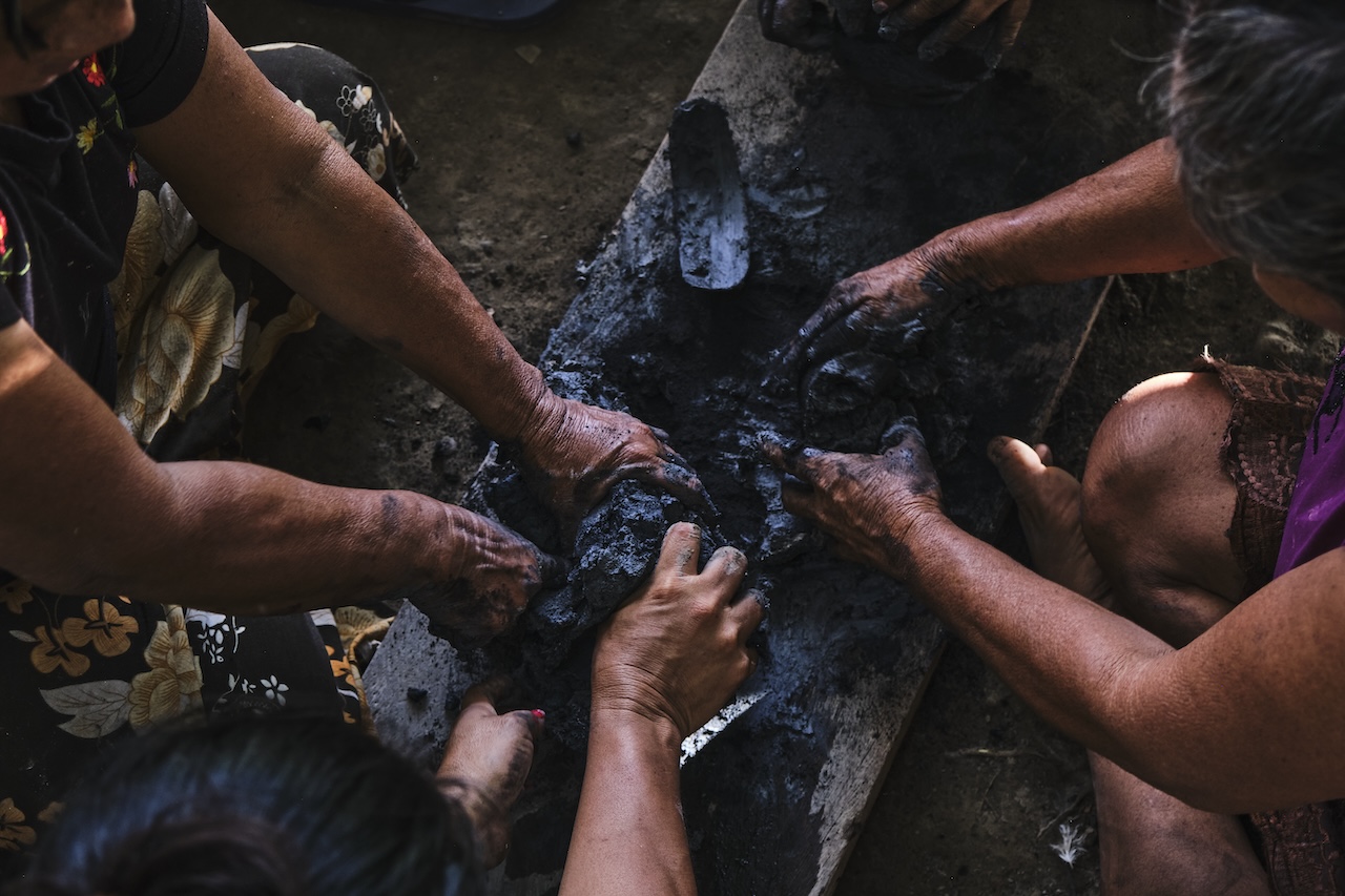 Después de cocer la cerámica, mientras las piezas aún están al rojo vivo, las mujeres añaden copal o«bin» al interior de la cerámica para sellar la arcilla, seguido de una resina natural de árbol para barnizar el exterior.